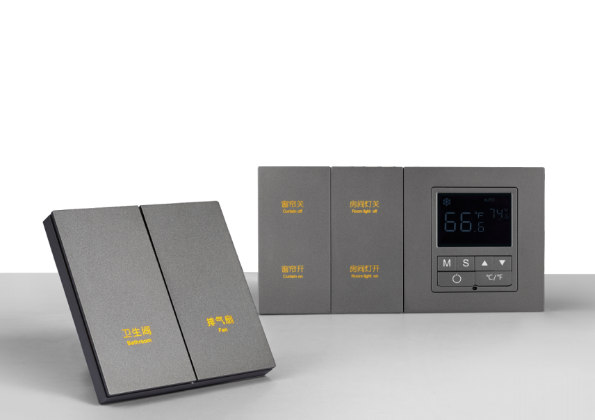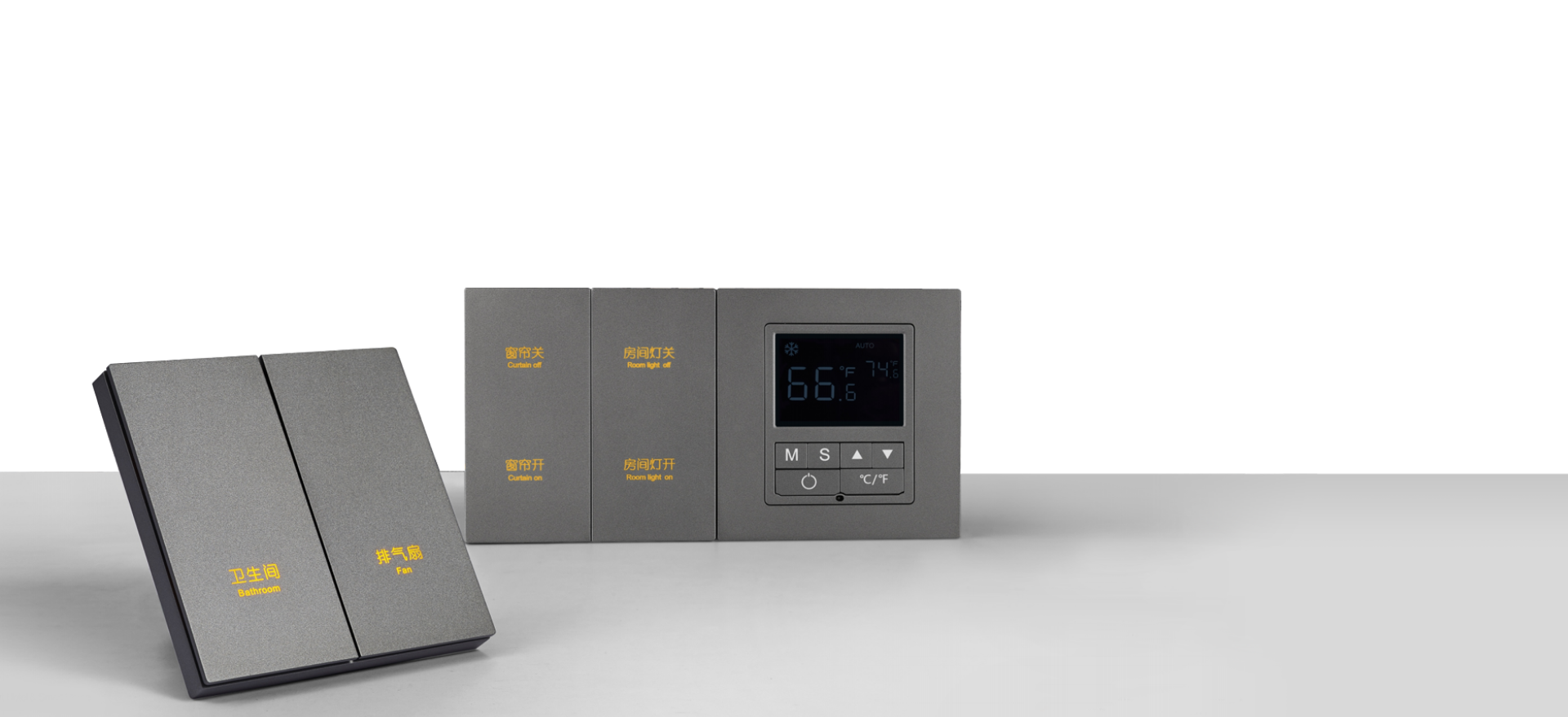 无级旋钮温度调节,LCD数显屏幕,呼吸式炫彩光圈;Zigbee通讯、485通讯模式;可配合VRV空调网关组建VRV空调智能控制系统。